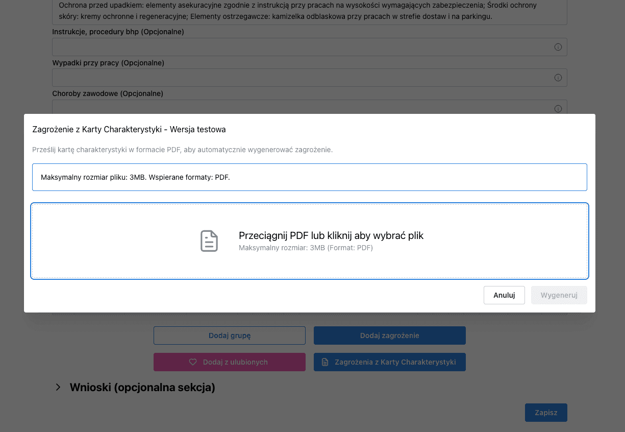 Wczytanie karty charakterystyki do iRyzyko eliminuje konieczność ręcznego opracowywania danych. System automatycznie pobiera i porządkuje najważniejsze informacje potrzebne w procesie oceny ryzyka zawodowego, skracając czas przygotowania dokumentacji nawet o kilkadziesiąt minut dla każdej substancji. Dzięki temu praca nad oceną ryzyka jest bardziej uporządkowana i ogranicza ryzyko błędów wynikających z ręcznego przepisywania danych, co bezpośrednio usprawnia realizację oceny ryzyka zawodowego.